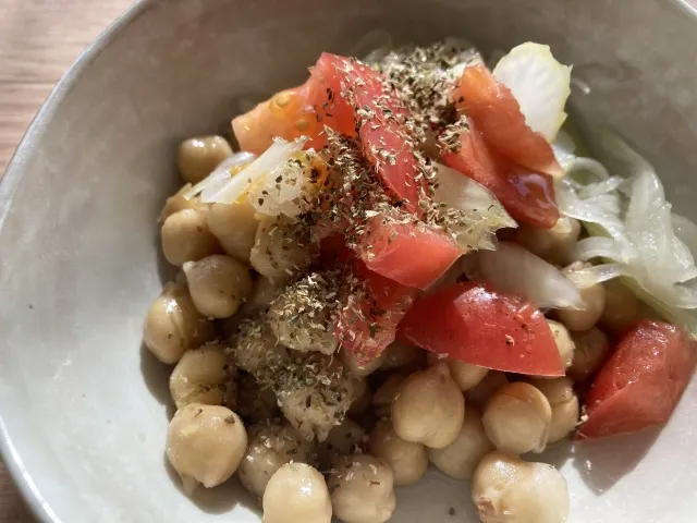 - 삶은 병아리콩에 채소(오이, 토마토, 양파 등) 추가